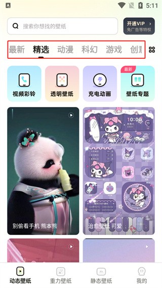 2、进入动态壁纸可选择动漫、科幻、游戏、创意、充电、美女、风景、动物、体育等动态壁纸,让你的爱机更加炫彩夺目;