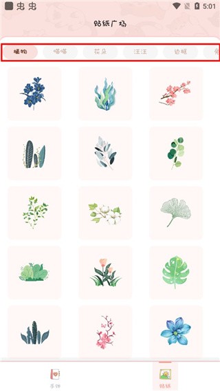 5、这里是贴纸广场,平台将贴纸进行了详细的分类,大家快来挑选喜欢的贴纸做手账吧!