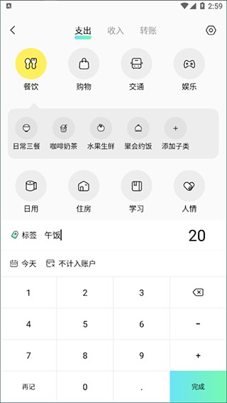 2、记账时你可以选择支出、收入、转账,每种板块下都有丰富的分类,每个分类还有许多子类可以选择,输入备注和金额后,再选择日期,最后点击“完成”即可;