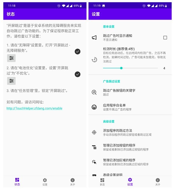 开屏跳过APP是一款非常好用的广告跳过类型的软件哦,大家可以在这里体验到非常简单的操作和丝滑的操作过程。很多不一样的功能都是可以直接去进行使用的哦,大家可以在这里感受到非常不错的体验,适合用于各种不一样的软件,只要几分钟内就可以上手了。