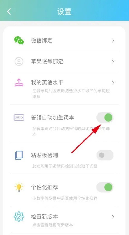 最后,在打开的设置页面,开启【答错自动加生词本】按钮即可。