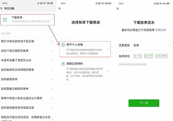 2、点击“下载账单”,选择“用于个人对账”,选择账单导出的时间范围,然后点击“下一步”,微信最多可以导出三个月的账单。