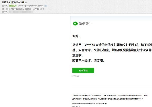 3、输入您的邮箱,邮箱会收到微信的账单文件,输入支付密码,验证完成后提示“申请已提交”。微信导出的文件是带有密码的压缩包,导出成功后,“微信支付”的通知里面会提示解压密码。
