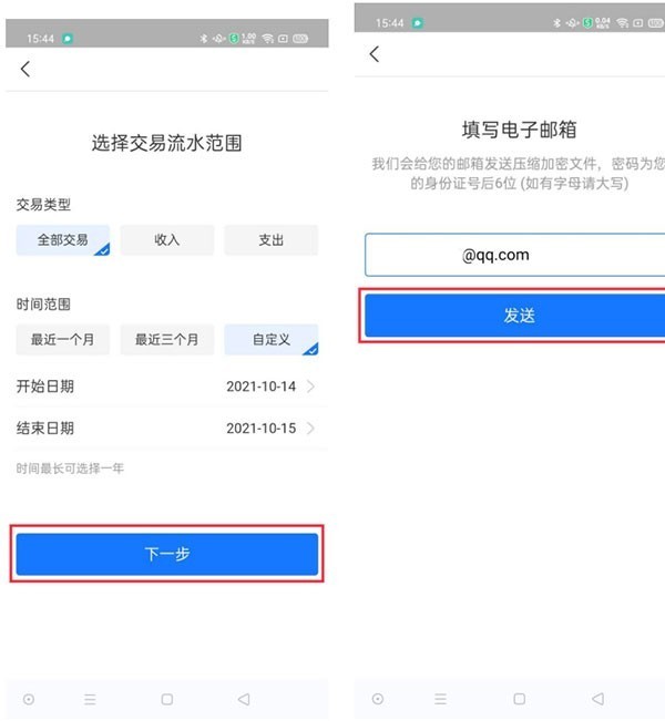 3、选择交易流水范围,点击【下一步】-填写电子邮箱,点击【发送】-确认无误后,点击【确认发送】