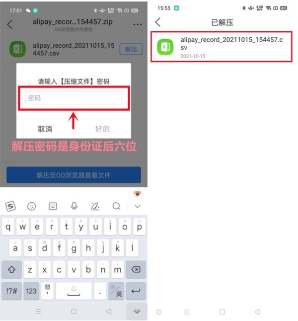 4、手机打开邮箱(建议下载QQ邮箱软件),打开收到的交易流水明细邮件-点击附件-选择解压软件-对附件进行解压