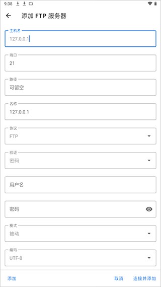 然后设置主机名设为127.0.0.1(关键,指服务器本机,这样传输的时候会直接走本机网络,速度极快)、端口(刚才设的)、路径(指刚才设置的根目录的相对路径,可不填)、名称(随便设一个,显示在列表里的名称,不设就是127.0.0.1)、协议(默认FTP)、验证(默认密码)、密码、模式(默认被动)、编码格式(默认UTF-8)。设置完保存,列表里出现刚才设置的名称。配置完成后启动下就可以使用ftp文件服务功能了