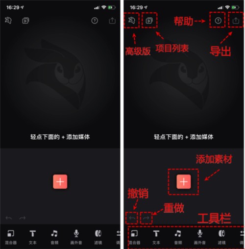 1、新建项目后,我们就可以在编辑状态的主页面按加号来从手机内添加素材到项目。图里也介绍下主界面的一些基本功能。