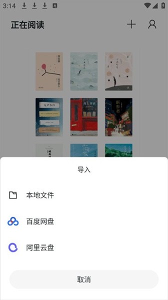 1、点击主界面的加号按钮,从手机文件夹里选择电子书文件,支持txt、epub等格式。