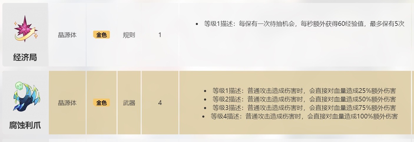 腐蚀利爪也是金色的晶源体型生化卡牌,该卡牌在1级的时候,当普攻攻击造成伤害时,可以给敌人的血量造成25%的额外伤害,卡牌一共能够升到4级,二级时的额外伤害为50%、3级额外伤害为75%、4级的额外伤害为100%。