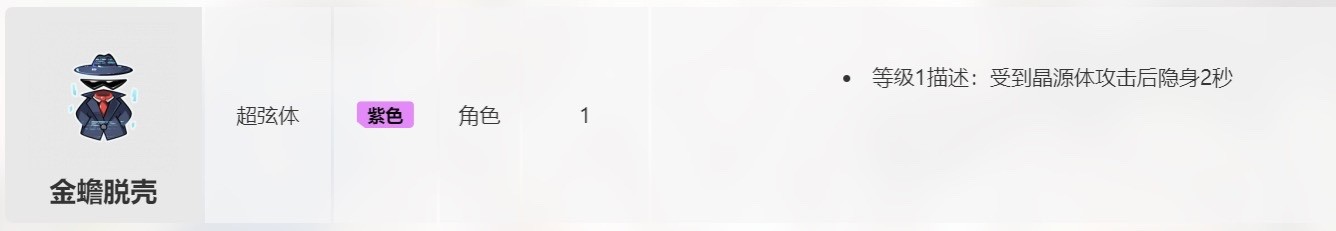 金朝脱壳和沙漏子弹一样,都是超弦体生化卡牌,不过金蝉脱壳卡牌是需要安装到角色身上才能生效的,该卡牌的效果为角色在受到晶源体的攻击以后,可以触发2秒钟的隐身效果。