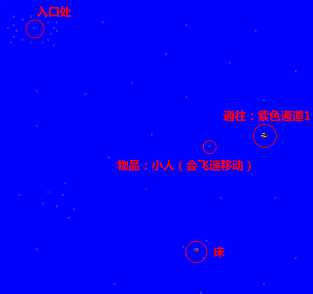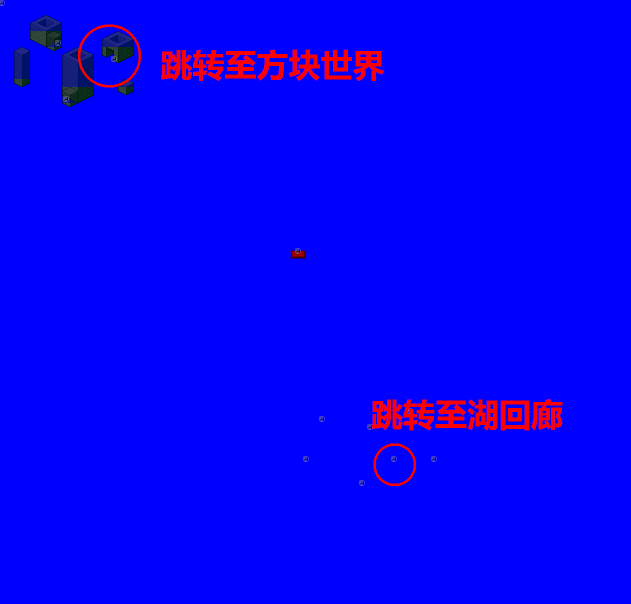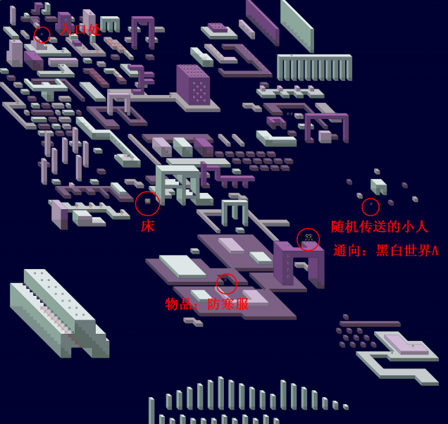 1、跟隐形人(上图标示的“随机传送的小人”)调查会传送到场景的方块上,有5分之1概率传送到白黑の世界A(黑白世界A)入口。