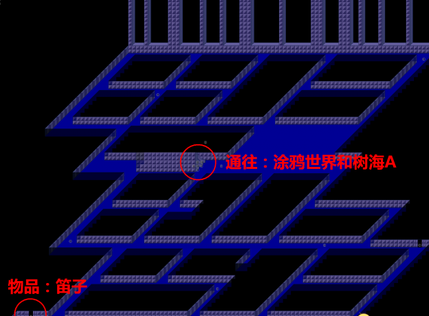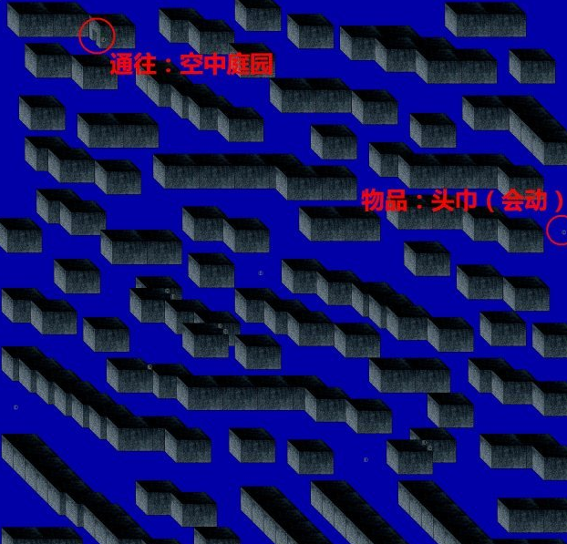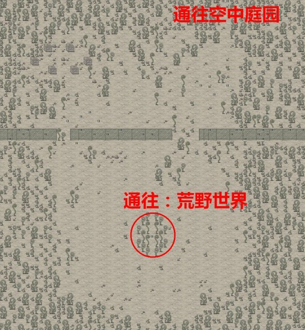 1、要到达空中庭园,需要从下向上穿过图中标出来的那片树林,同样没有场景移动的动画效果