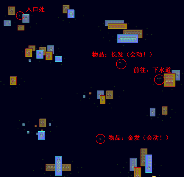 1、用菜刀刺杀最右上的房间(上面地图中标“死路”的位置)持剑的小兵有4分1概率得到100元。持剑的头目要刺击5次才会死,有2分1概率得到200元。