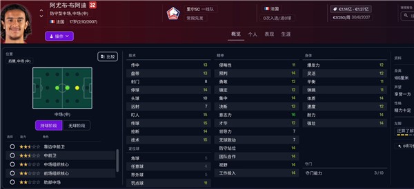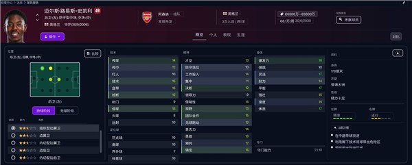 开档能力149、潜力181,豪门打首发没问题,技术栏盘带、传球、停球技术全都拉满,典型的巨型胚子。