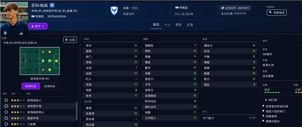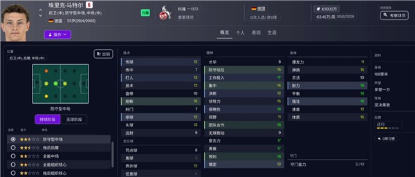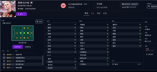 意志栏中意志力、工作投入和团队合作都是顶级,体质和耐力拉满,天生的B to B圣体,首推中前卫位置上的全能中场。