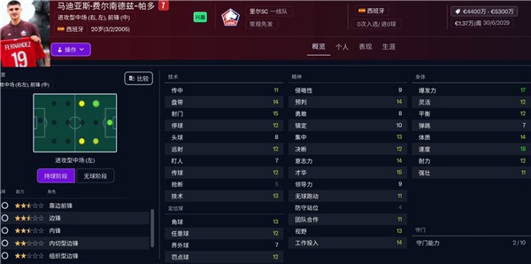熟练左后位,中场出身,中场和后腰的熟练度很高。