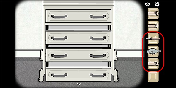 3、打开抽屉,第二格是小刀,第三格是一条鱼,第四格是第三支蜡烛;