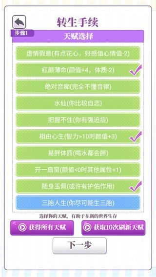 1、游戏开始,选择出生的三个天赋,每一个都会对你游戏中的攻略难度产生变化,要谨慎选择哦。