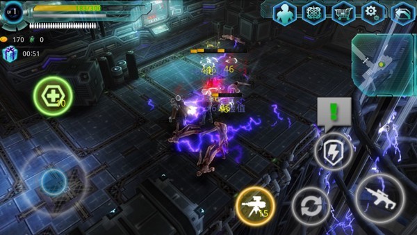 异形地带突袭修复版的操作不是很难,进入游戏后玩家可以看到界面左下角有个圆环按钮,这个按钮是用来控制角色移动的,玩家想让角色往哪个方向移动就按住该按钮向哪个方向移动即可。玩家在移动的过程中要根据地面上绿色箭头的指示来,如果遇到异形生物的时候,玩家点击界面右下角带枪图标的按钮就可以发射子弹攻击目标,此外游戏中还提供了一个道具,那就是有黄色图标的机枪标志,当玩家点击该图标,就可以使用释放机枪塔自动攻击。