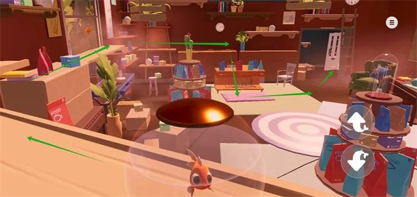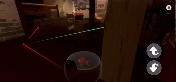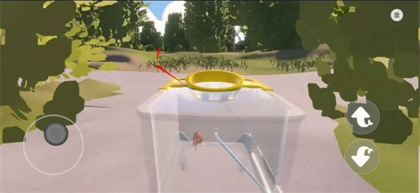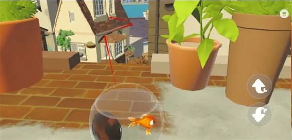 10、跟随红色箭头掉落到花丛上(否则鱼缸破碎死);然后那个缺口跳下去即可