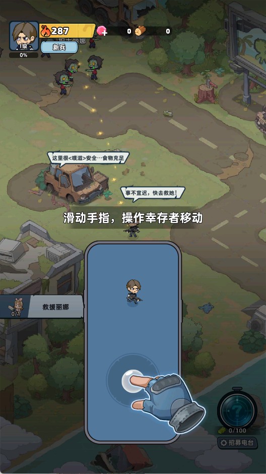 1、通过滑动手指操作幸存者移动,优先前往安全区域救援队友、搜集物资。