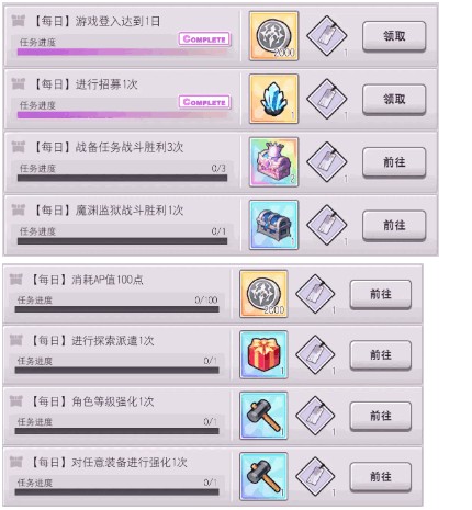新玩家的每日任务初始数目为8个(后续将会以序号①~⑧作为代替)