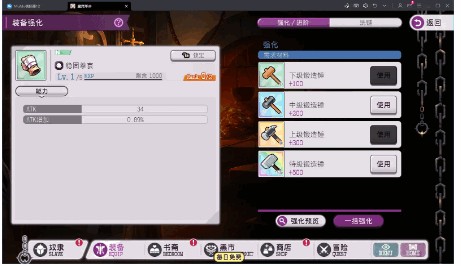 初期不建议使用一键强化功能,容易造成好感度礼物的浪费;后续有些角色不需要太多资源培养,一键强化能会导致资源的分配不合理,影响后续游玩体验等级强化需要气息为材料,以猫猫为例需要森之气息,否则无法突破等级上限⑧(难度指数1):装备强化的寻找路径为:主界面左下角——装备——选定一个装备——强化