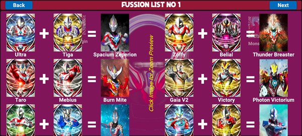 3、点击右上角fussion list可以查看欧布奥特曼不同形态的合成方式;