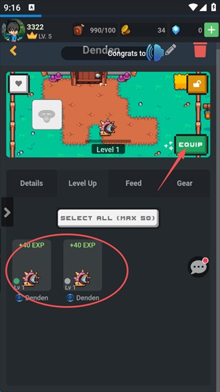 7、宠物可以通过打怪升级,也可以点击屏幕右侧偏上的“EQUIP”装备宠物。