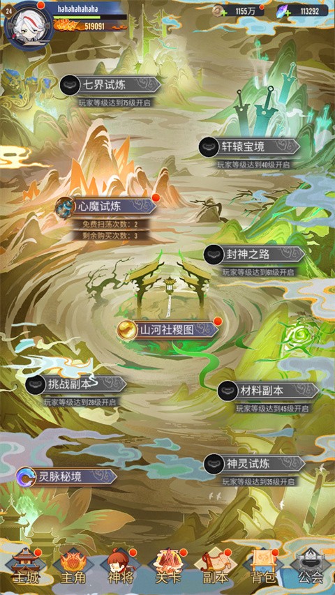 挑战心魔试炼:获取神将升级材料,每关还能得“仙豆”抽神兵(快速提升属性);