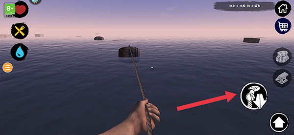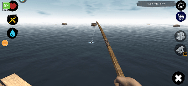 最初资源有限,需要利用钩爪获取资源,有时候还能看到各种小岛屿,利用船锚使木筏停下来,建造一把斧头可以上去采集更多的资源,后期实力强大起来,可以通过安装捕网道具在海面上能更被动化的获取资源。