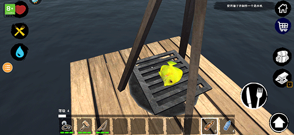 1、首先进入游戏之后,在木筏上准备好生活必需品:淡水收集器,火、床等