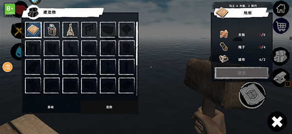 比如是地基,木板,楼梯,柱子等,一只创造锤就能解决任何与建造相关的问题。当鲨鱼攻击地基的时候要及时利用木质矛去反击,一来通过事后修补能减少相比建造木筏来说更多资源的消耗,二来鲨鱼在收到一定程度的攻击后便会死亡,在尸~体消失的这段时间里,可以不受危险的在附近周围搜刮资源,当然别忘记了还有鲨鱼肉可以吃。