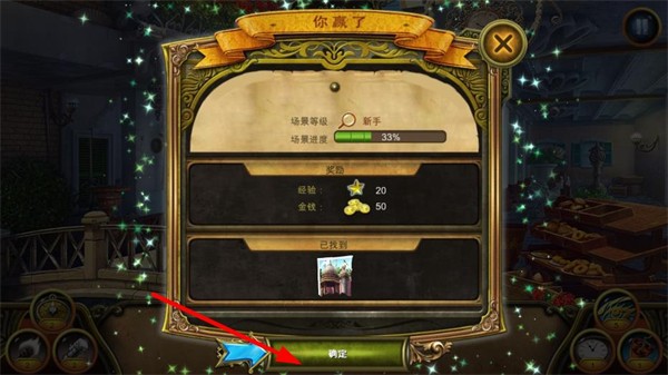 当所有目标物品都收集完成后,玩家将进入通关界面。在这里可以获得丰厚的经验值和金钱奖励,这些奖励可以用来解锁新的游戏内容或提升角色能力。点击确定按钮后,当前关卡的挑战就正式完成了。