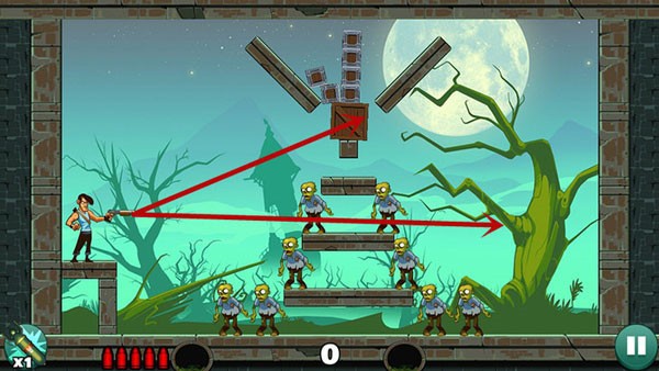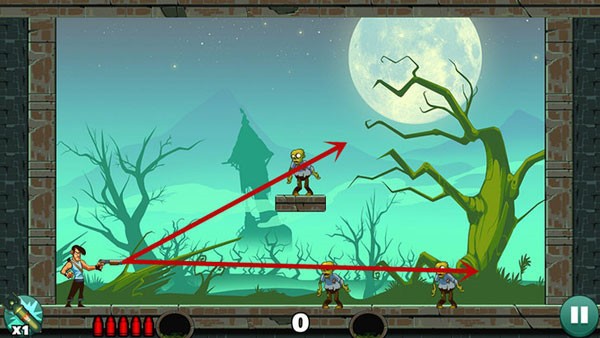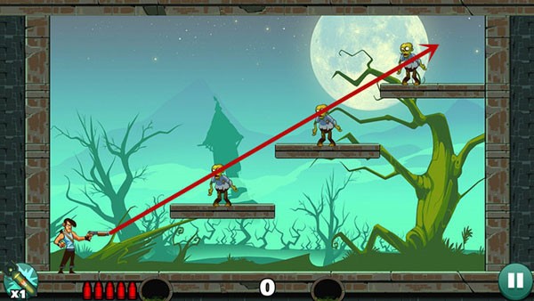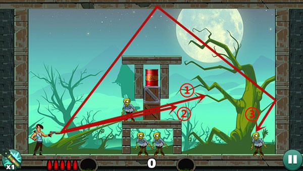 操作相对轻松,底部僵尸可以用直线射击解决,上方敌人则借助墙面反射来命中,角度不熟时多尝试几次即可掌握。