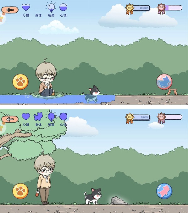 选择都会对【心跳】、【身体】、【智商】、【心情】四个值产生影响,其中一个值降到最低,狗狗就会离开哦,所以要认真的分析情况再做选择呢~