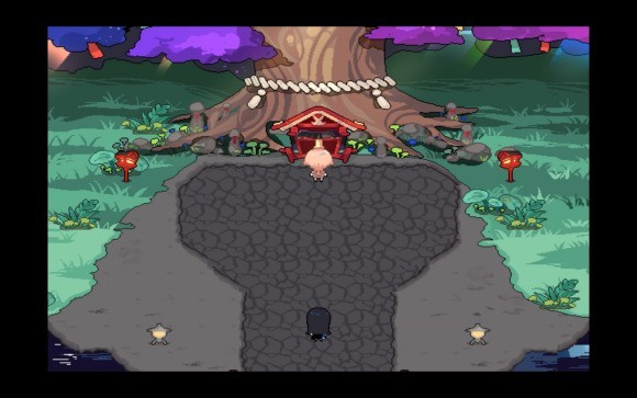 然后镜再一次回到了山脚,同时在如图所示的位置会刷新第一只可以互动的npc,也就是我们后续也会遇到的商人,个人感觉这个小妖精很可爱的,目前他会卖止血草,不过现在肯定是用不上啦。