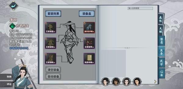 2、唐婉推荐王家套、自带饰品、道济拳或济世拳,有充足资源的人可以合道济套,但吃资源比较多,不推荐pve时期就合。