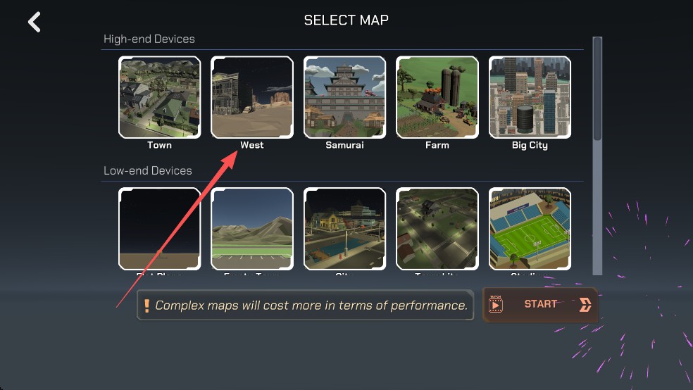 3、进入模式后,这里我们可以上下滑动,选择不同的地图去放烟花,选择好后点击start即可进入。