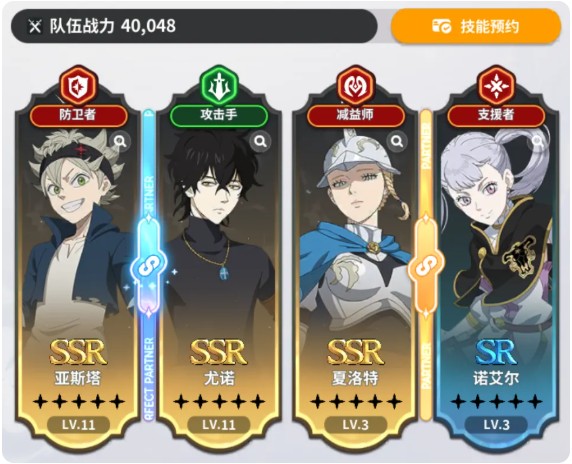 在推进到第1章第3节时,我们会获得【亚斯塔+尤诺+夏洛特】的SSR魔导士组合。根据实际情况再配置任意一位魔导士的话,可靠的「前期阵容」就诞生啦!建议重点养成尤诺,他优秀的战斗能力在冒险中能为你披荆斩棘,让你有个舒服的游戏体验!