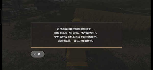 3、这是游戏初期您拥有的田地之一,田里的小麦已经成熟,是时候收割了,使用联合收割机即可收割田里的作物,右侧滑动条是油门,控制前进后退,左侧的方向盘控制左右转弯。