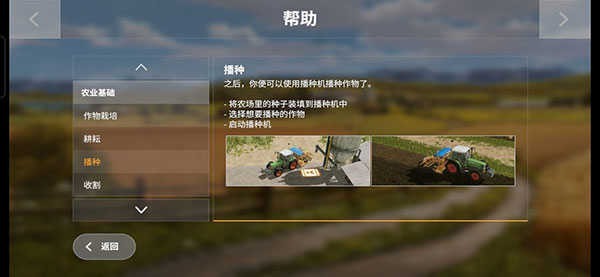 绿色拖拉机是芬特515c,后面有一台播种机,需要玩家自己挂接,操作非常简单,游戏里只需要倒车就可以自动连接了,这里是让玩家熟悉农机的接挂以及播种机的使用,除了部分高端播种机可以实现耕、播、施肥三合一,其他播种机只能在耕好的地上播种,像上面那块茬地,初级的播种机是无法直接作业的。