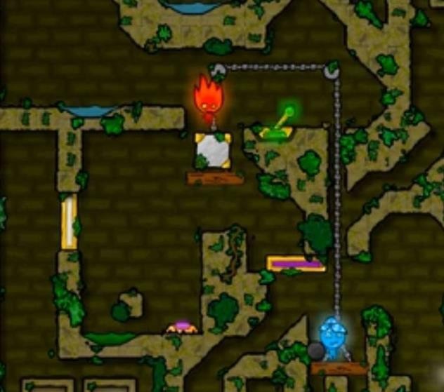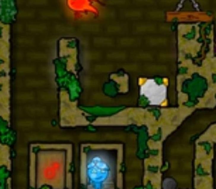 3、当冰角色到达铁球位置时,火角色跳至对面的板子上。