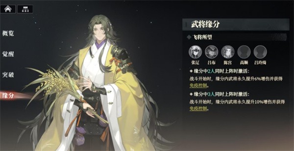 激活“飞将所望”羁绊将使该组合获得额外的永久增伤与免疫控制效果。上场两人可获得6%全程增伤并免疫控制,三人及以上则增伤提升至10%。这种缘分加成在战斗开局即触发,适合构建高爆发、高抗性、前后排全员受益的全能型阵容。