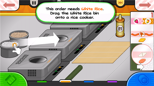 7、接下来玩家可以依据教程提示,开始制作寿司;