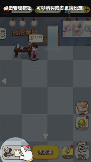 1、首先我们进入理发店模拟器游戏中,刚开始游戏时我们需要购买一些设备才能正常开业;