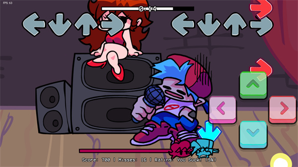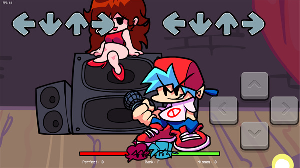 4、你需要不断随着节拍和音乐及时按下箭头,才能打败boss,下方是我们的游戏进度条,我们要让我们的进度条尽量的靠左。如果你喜欢挑战手速,并且喜欢不同的模组版本,那周五放克夜错误化模组整合版你一定要来试试。