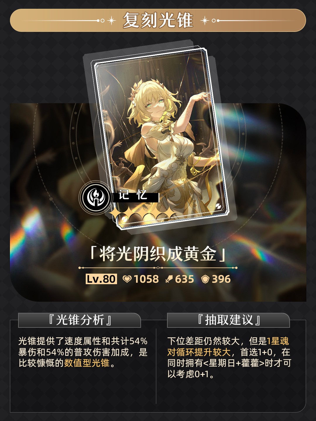 限定5星光锥「将光阴织成黄金(记忆)」,可通过光锥活动跃迁「溯回忆象•将光阴织成黄金」获得。