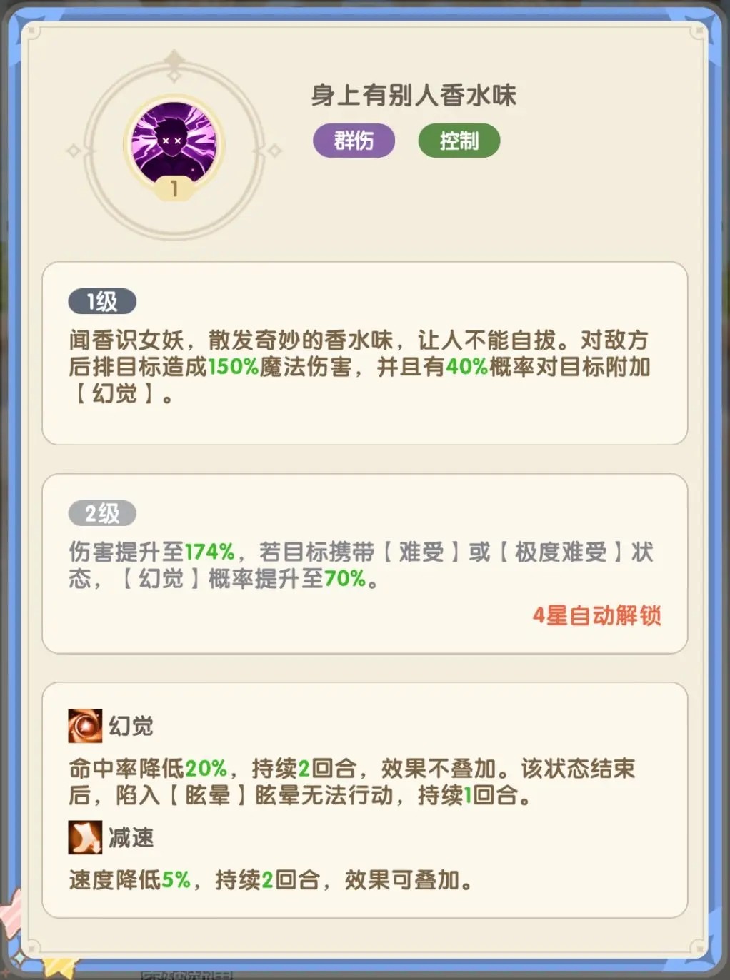 “幻觉” 不仅降低敌方命中率,结束后还能使目标 陷入眩晕,是关键时刻的绝佳控制技能。