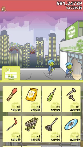 游戏开始,我们是被一群僵尸追赶至昏迷,醒来后,在一家建材超市里面,僵尸暂时进不来。我们现在的首要任务,就是创造不同的道具,来抵挡不断进行攻击的僵尸。在屏幕右上方,是你的金币显示额以及每秒钟你的金币增长速度。屏幕下方,是你获得物品的地方,将物品组合获得道具的地方。历史是一个可以将你的游戏记录回放的地方。屏幕右边,是你可以使用的道具以及你正在使用的道具。这个游戏,使用了道具之后,道具会自行对僵尸进行攻击,同时,你的金币也会自动增长,就算是在游戏玩家退出游戏后,道具也是会发动攻击的。